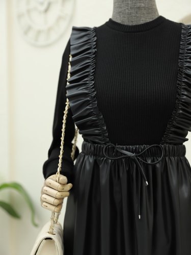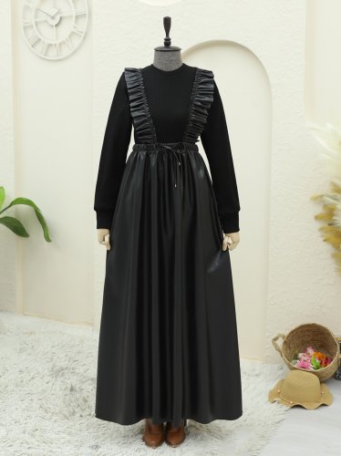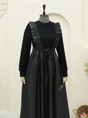 Üstü Triko Önü Fırfırlı Deri Elbise -Siyah