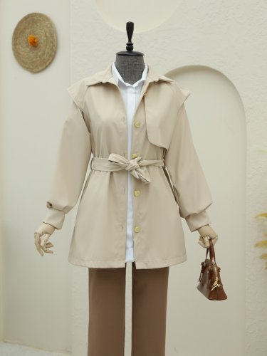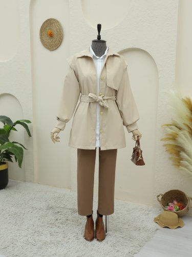 Broş Düğmeli Çift Düğmeli Kemerli Trençkot -Bej