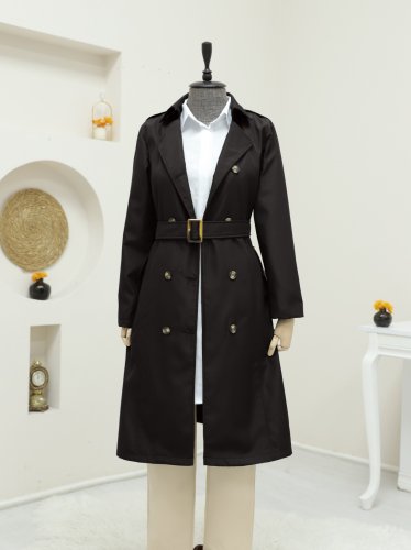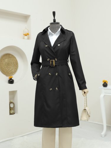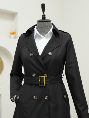 Düğmeli Kemerli Ara Boy Trençkot -Siyah