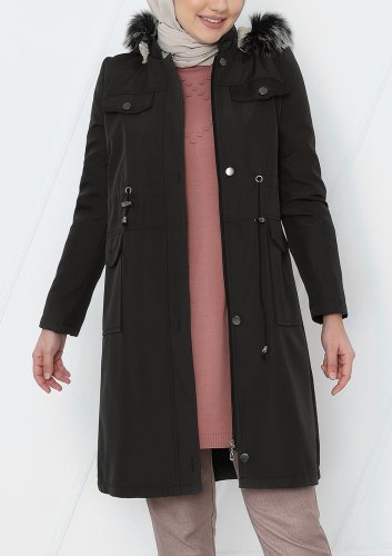 Çıkma Kapşonlu Bağcıklı Bondit Kısa Kaban -Siyah
