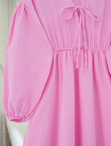 Yakası Bağlamalı Kolu Ve Beli Lastikli Müslin Elbise -Pembe