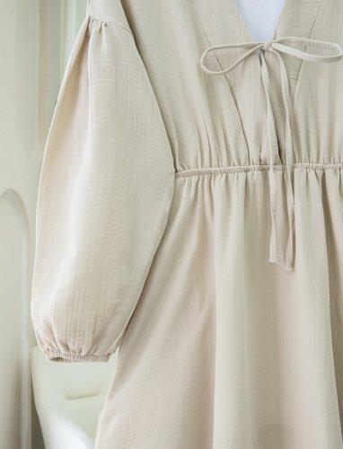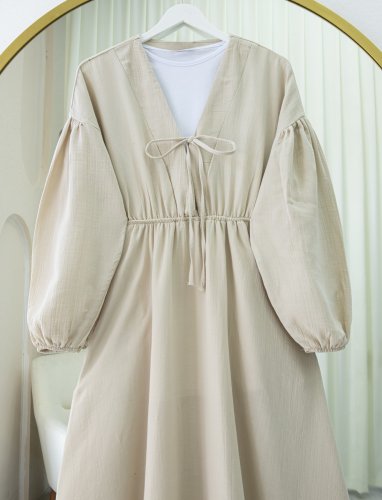 Yakası Bağlamalı Kolu Ve Beli Lastikli Müslin Elbise -Taş