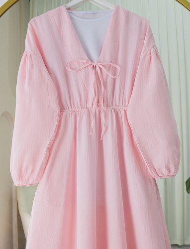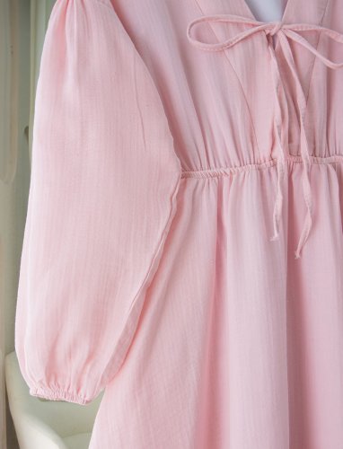 Yakası Bağlamalı Kolu Ve Beli Lastikli Müslin Elbise -Pudra