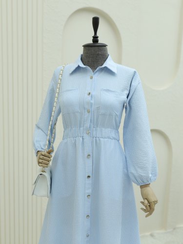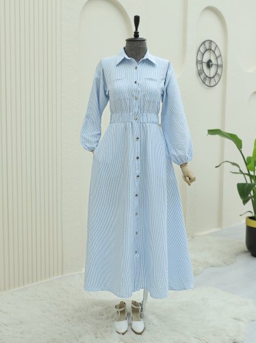Beli Lastikli Boydan Düğmeli Çizgili Elbise -Bebe Mavi