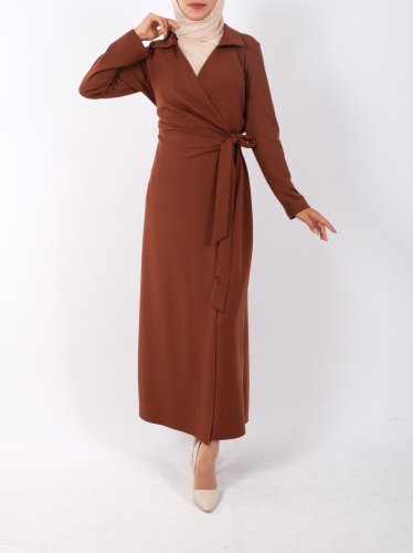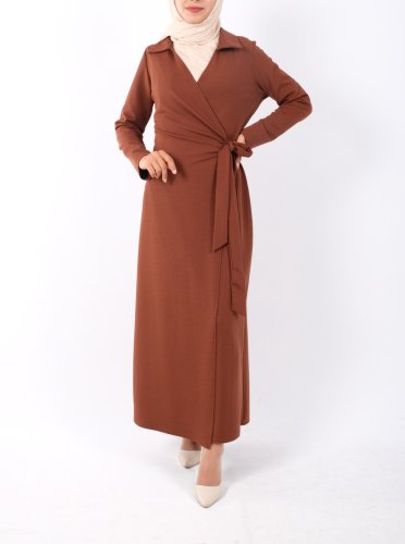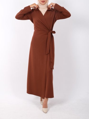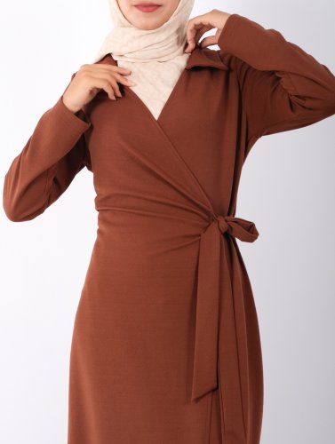 Önü Çift Kat Yandan Bağlamalı Elbise -Kahve