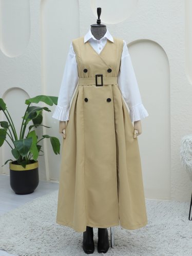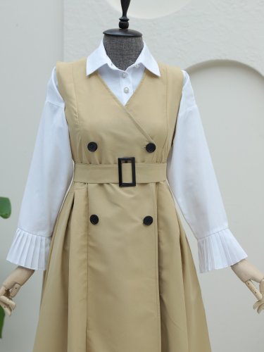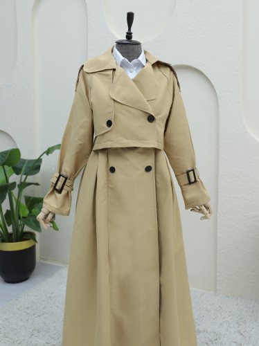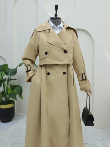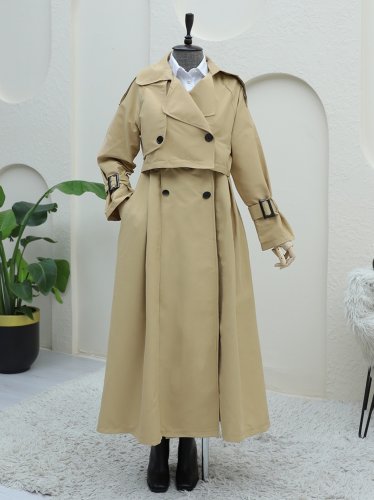Eteği Pliseli Bolerolu Kemerli Trençkot -Vizon