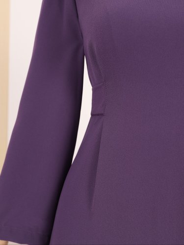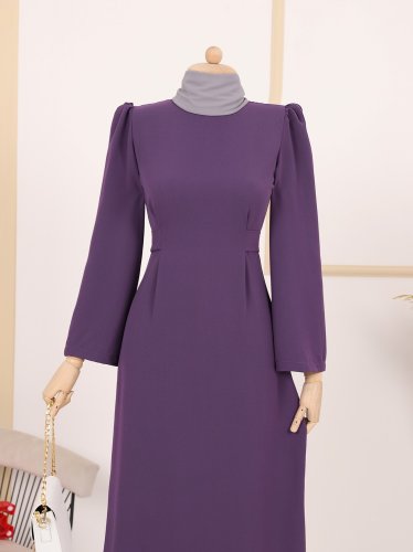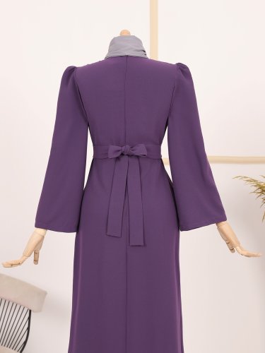 Hakim Yaka Belden Bağlamalı Elbise -Mor