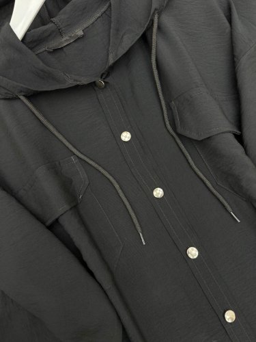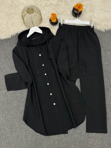 Metal Düğmeli Kapşonlu Pantolonlu İkili Takım -Siyah