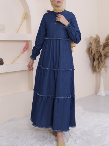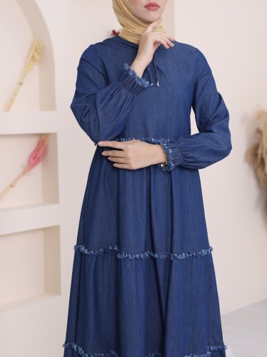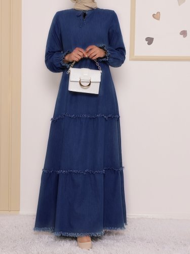 Üç Parça Yıkamalı Kot Elbise -İndigo