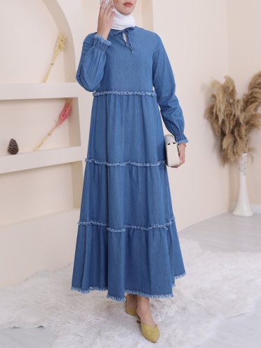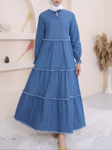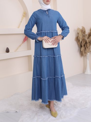Üç Parça Yıkamalı Kot Elbise -Mavi