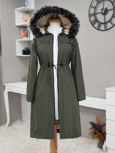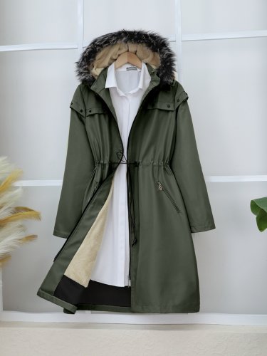Çıkma Kapşonlu Yıldız Metal Detaylı Kaban -Haki