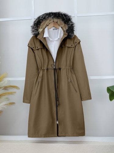 Çıkma Kapşonlu Yıldız Metal Detaylı Kaban -Taba