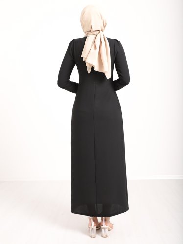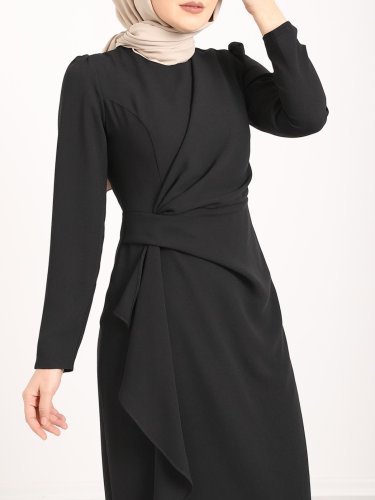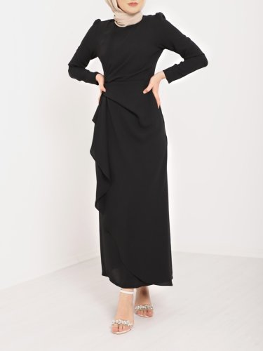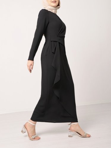 Önü Allerli Eteği Asimetrik Krep Elbise -Siyah