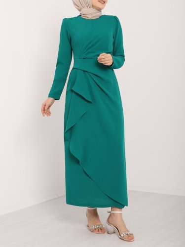 Önü Allerli Eteği Asimetrik Krep Elbise -Zümrüt