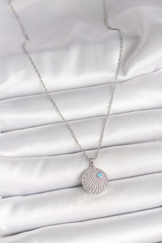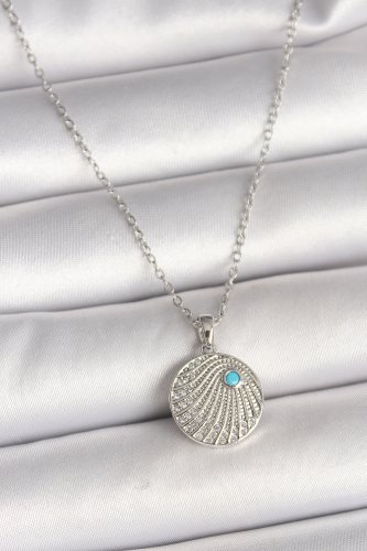 316L Çelik Gümüş Renk Zincir Zirkon Taşlı Mavi Taş Detaylı Madalyon Model Kadın Kolye