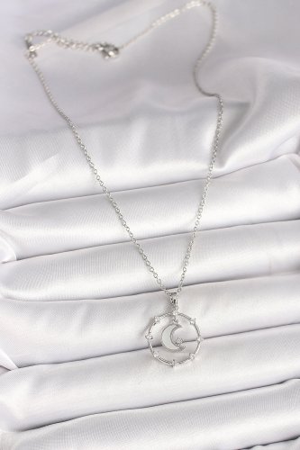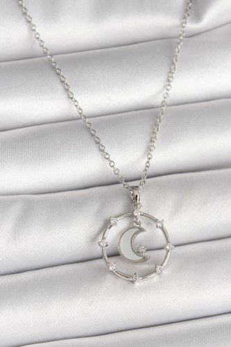 316L Çelik Gümüş Renk Zincir Zirkon Taşlı Beyaz Mineli Hilal Model Kadın Kolye
