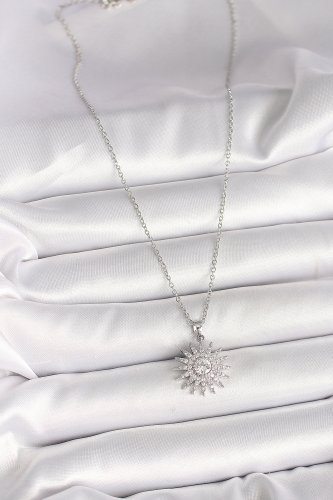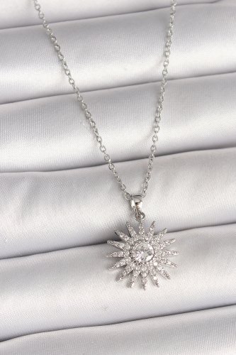 316L Çelik Gümüş Renk Zincir Zirkon Taşlı Güneş Model Kadın Kolye