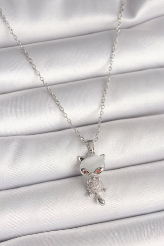 316L Çelik Gümüş Renk Zincir Zirkon Taşlı Kedi Model Kadın Kolye
