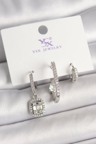 Pirinç Gümüş Renk Zirkon Taşlı Baget Halka Model 3Lü Kadın Kombin Küpe