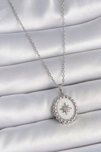 316L Çelik Gümüş Renk Zincir Beyaz Mineli Kutup Yıldız İşlemeli Madalyon Model Kadın Kolye