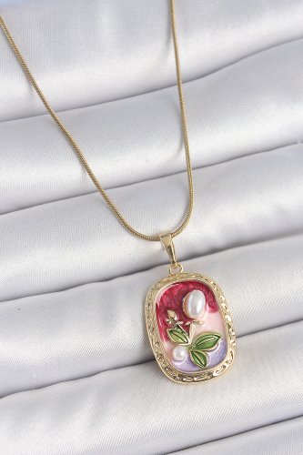 316L Çelik Gold Renk Zincir Mix Renk İncili Çiçek İşlemeli Portre Model Kadın Kolye