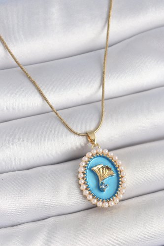 316L Çelik Gold Renk Zincir Mavi Mineli İncili Zirkon Taşlı Çiçek İşlemeli Portre Model Kadın Kolye
