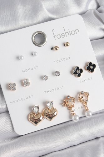 Pirinç Gold Renk Zirkon Taşlı Kalp Figür Siyah Yonca Detay 7 Çift Kadın Küpe Seti