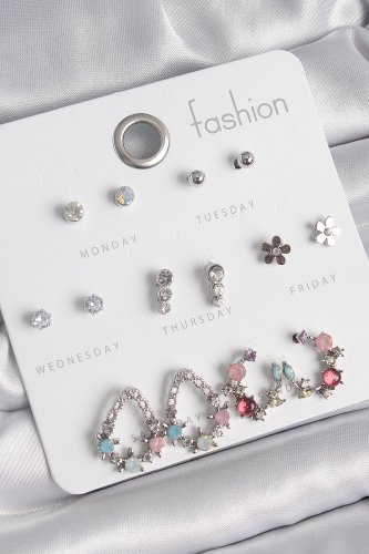Pirinç Gümüş Renk Zirkon Taşlı Damla Model Çiçek Detay 7 Çift Kadın Küpe Seti
