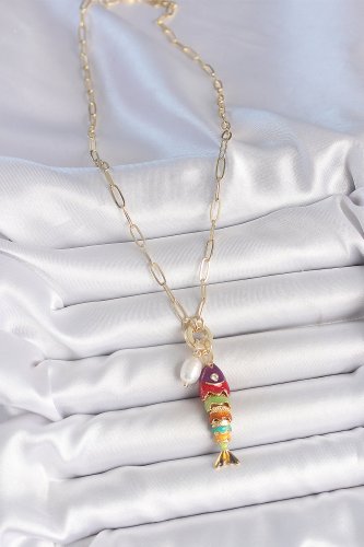 İnci Detaylı Zirkon Taşlı Rainbow Balık Figürlü Gold Renk Pirinç Kolye
