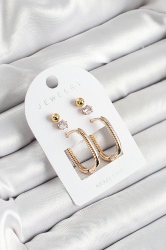 Pirinç Zirkon Taş Ve Dikdörtgen Figürlü Gold Renk 3lü Çift Kadın Küpe Set