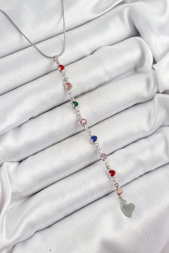 Pirinç Gümüş Renk Karışık Renk Zirkon Taşlı Kalpli Y Kadın Kolye