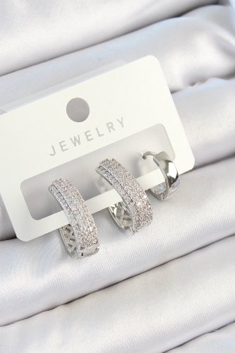 Pirinç Zirkon Taşlı Damla Model Gümüş Renk 3lü Çift Kadın Küpe Set