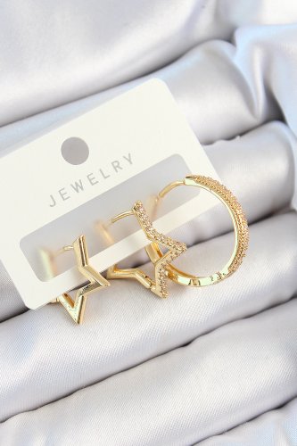 Pirinç Zirkon Taşlı Yıldız Ve Halka Model Gold Renk 3lü Çift Kadın Küpe Set
