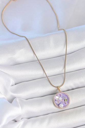 316L Çelik Gold Renk Zincir Zirkon Taşlı Mor Mineli Çiçek İşlemeli İnci Detay Portre Model Kadın Kolye