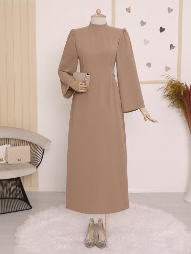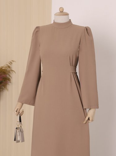 Hakim Yaka Belden Bağlamalı Elbise -Vizon