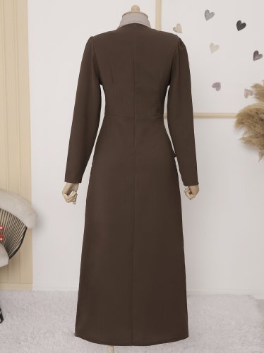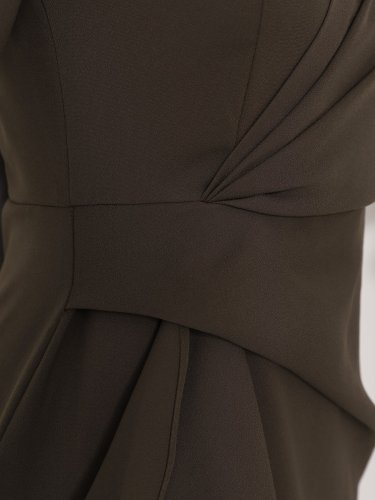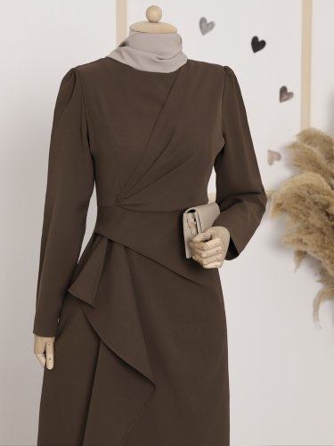 Önü Allerli Eteği Asimetrik Krep Elbise -Kahve