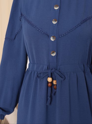 Yarım Düğmeli Parçalı Bağcıklı Elbise -Koyu Mavi