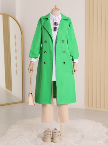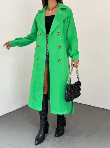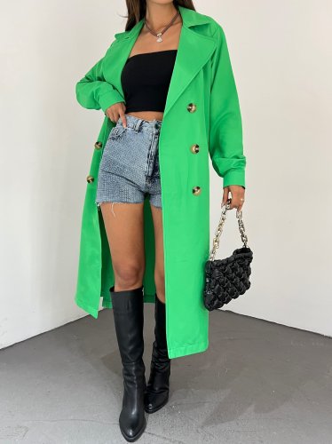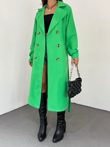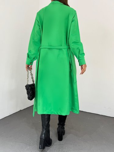 Çift Düğme Kemerli Uzun Trenckot -Yeşil