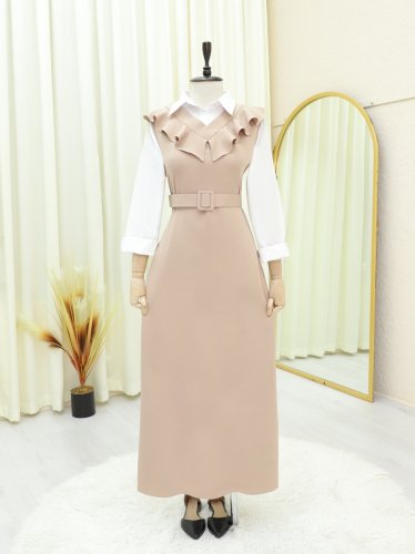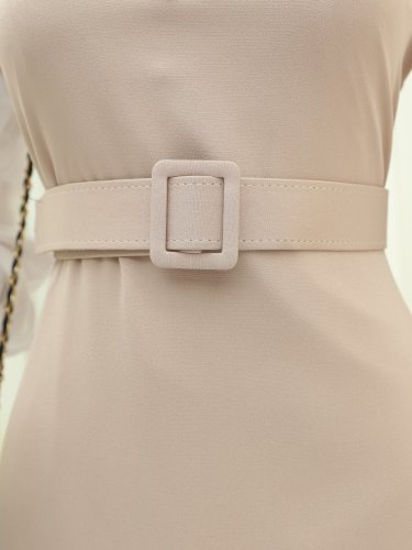 Yakası V Kemerli Uzun Jile Elbise -Bej