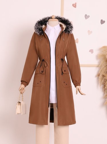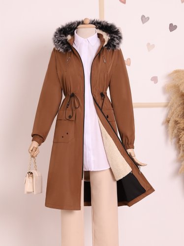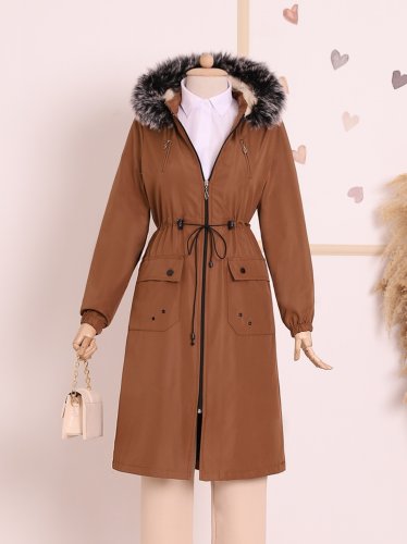 Cepleri Kuşgözlü Çıkma Kapşonlu Bondit Kaban -Taba