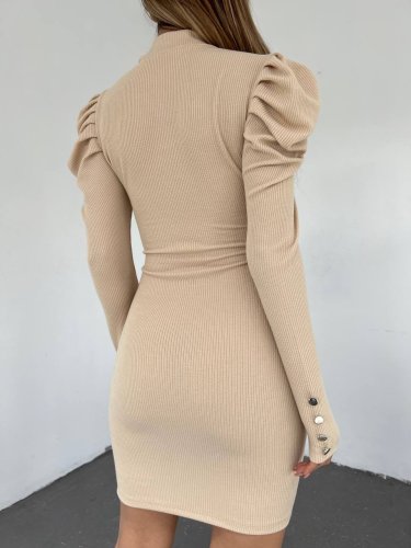 Prenses Omuz Kol Ucu Düğmeli Elbise -Bej