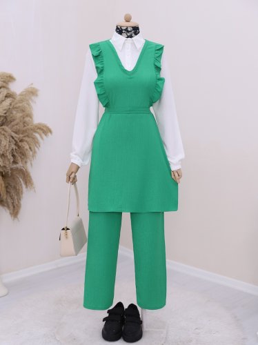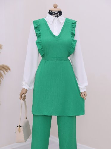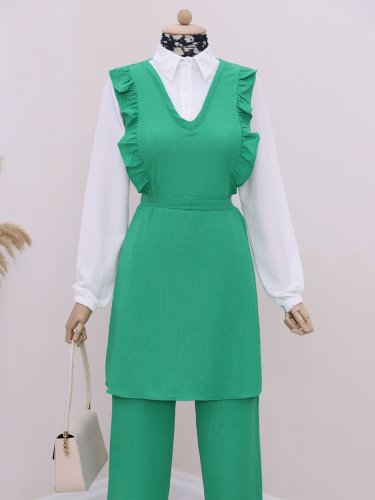 Önü Fırfırlı Yarım Düğmeli Gömlek Yaka İkili Krınkıl Takım -Yeşil
