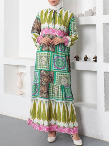 Etnik Desen Bağcıklı Kolu Lastikli Elbise -Yeşil