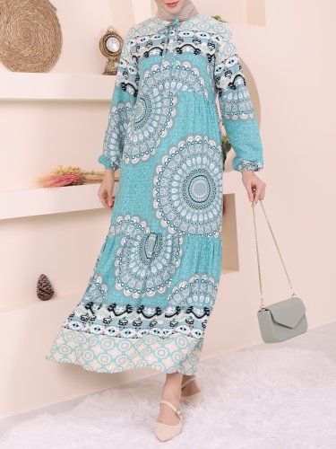 Parçalı Deseli Bağcıklı Kolu Lastikli Elbise -Mint
