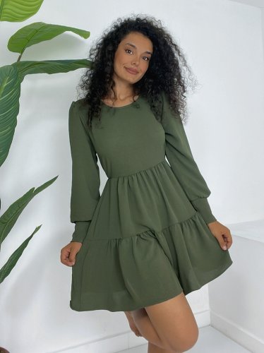 Yuvarlak Yaka Beli Lastikli Eteği Katlı Ayrobin Elbise -Haki