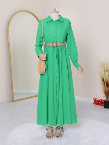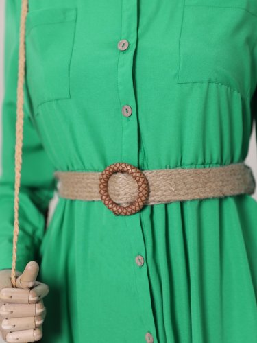 Boydan Düğmeli Kemerli Gömlek Elbise -Yeşil