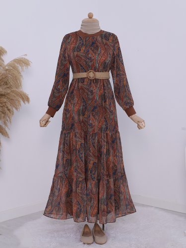 Etnik Desen Eteği Parçalı Astarlı Şifon Elbise -Kahve