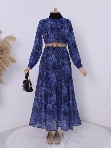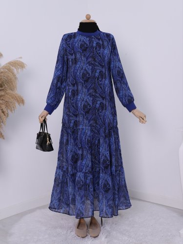 Etnik Desen Eteği Parçalı Astarlı Şifon Elbise -Laci