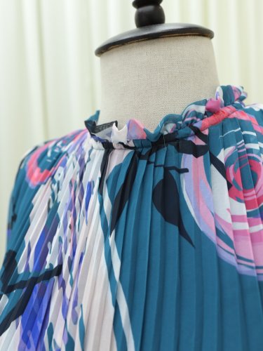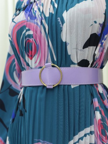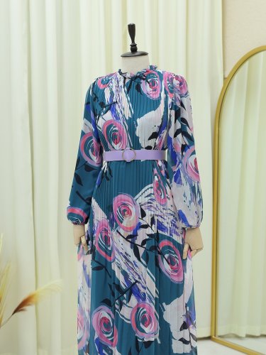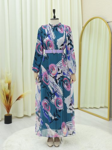 Önü Pileli Kemerli Şifon Elbise -Petrol