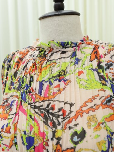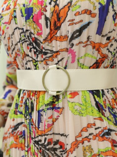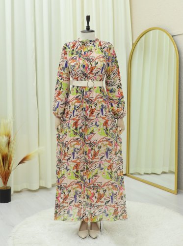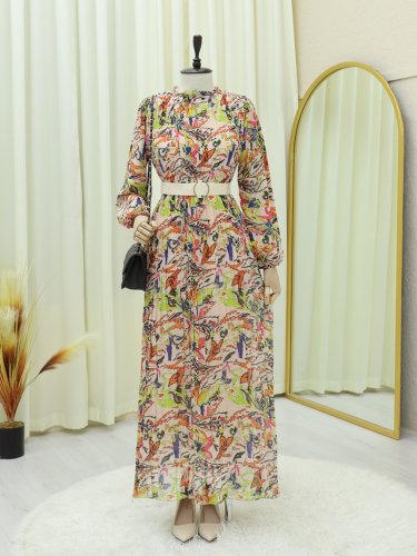 Önü Pileli Kemerli Şifon Elbise -Somon